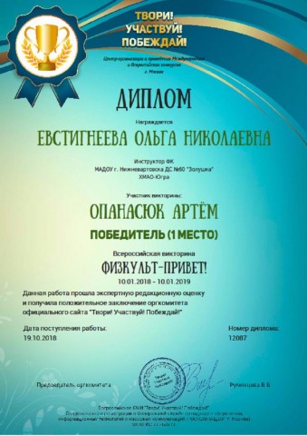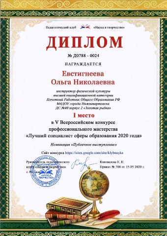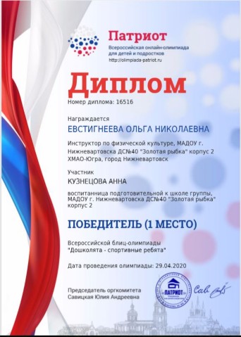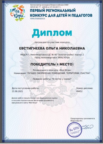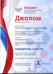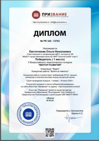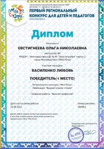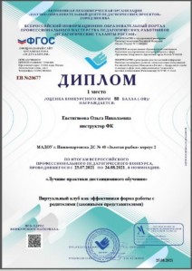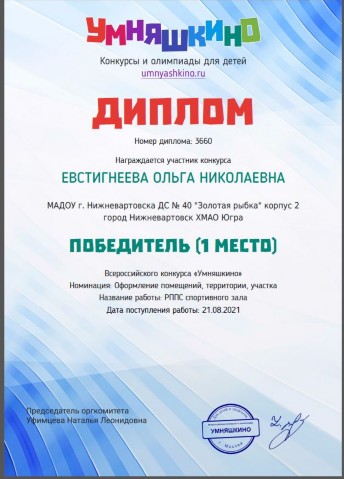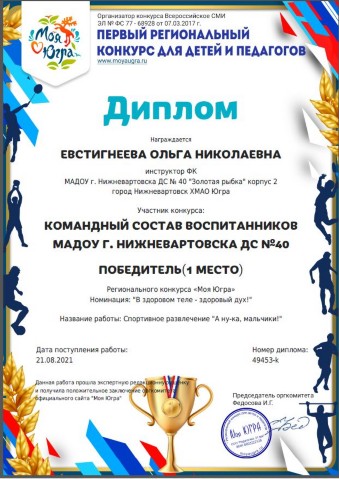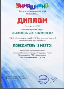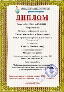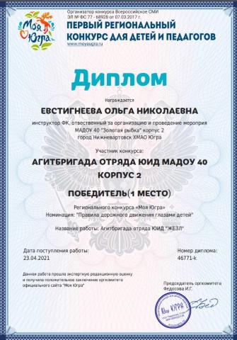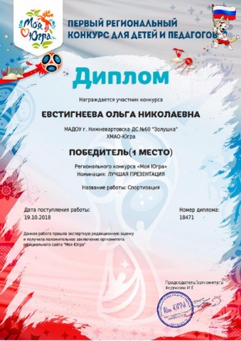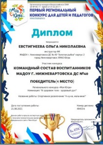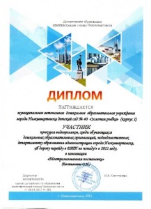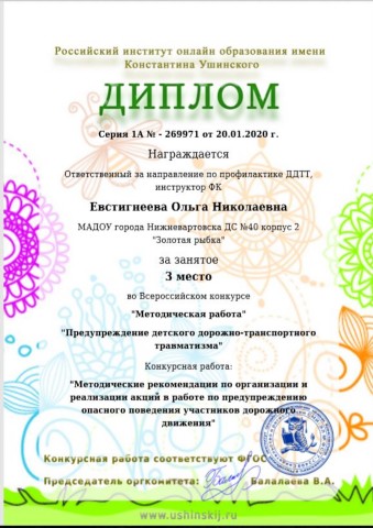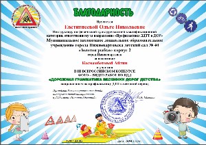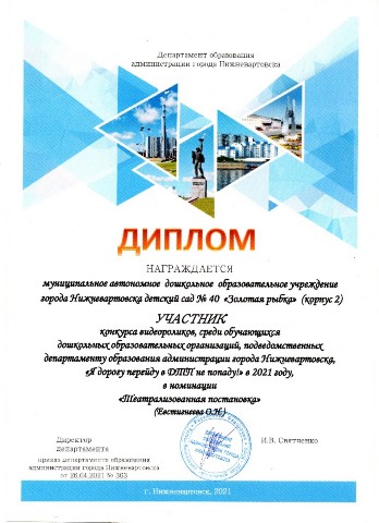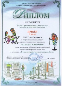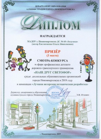 Диплом Департамента образования администрации г. Нижневартовска, МАДОУ г. Нижневартовска ДС № 60 "Золушка" за победу в смотре-конкурсе в сфере профилактики детского дорожно-транспортного травматизма "Наш друг светофор", в номиниации "Лучшая авторская разработка"