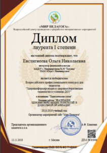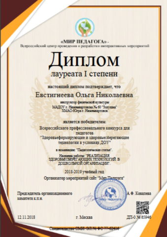 Диплом лауреата I степени Всероссийского профессионального конкурса педагогов "Здоровьеформирующие и здоровьесберегающие технологии в условиях ДОУ"