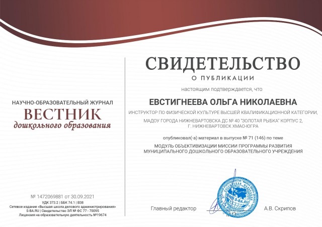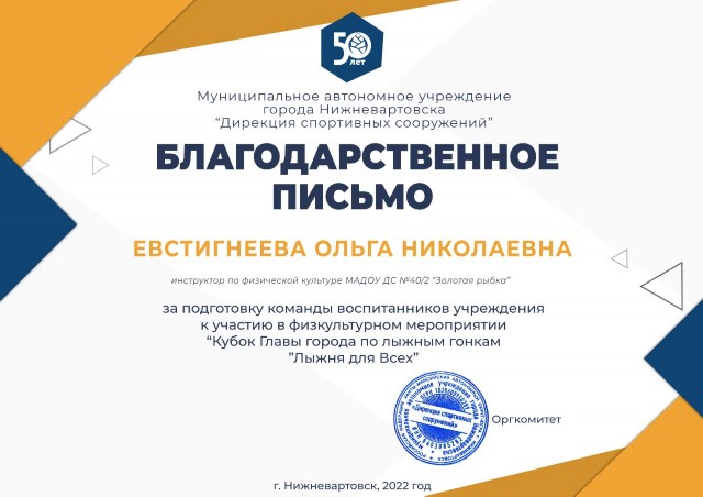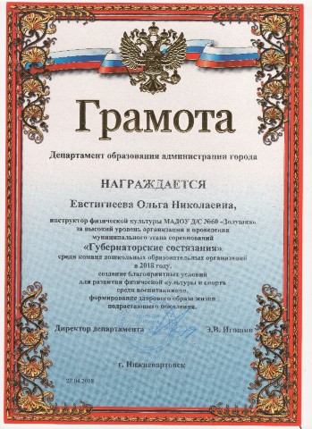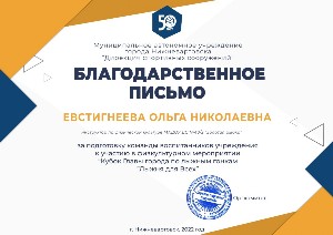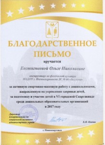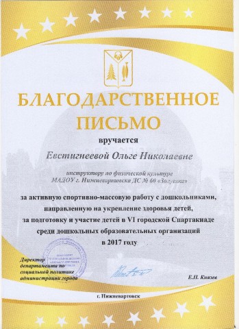 Благодарственное письмо Департамента образования администрации г. Нижневартовска за подготовку и участие воспитанников в VI городской Спартакиаде среди дошкольных образовательных организаций