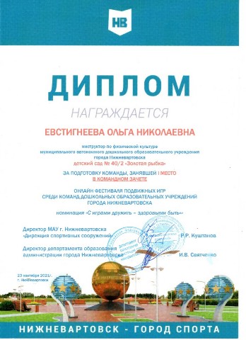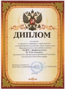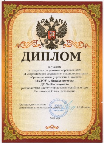 Диплом Департамента образования администрации г. Нижневартовска за участие команды МАДОУ г. Нижневартовска ДС № 60 "Золушка"в Губернаторских состязаниях