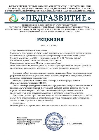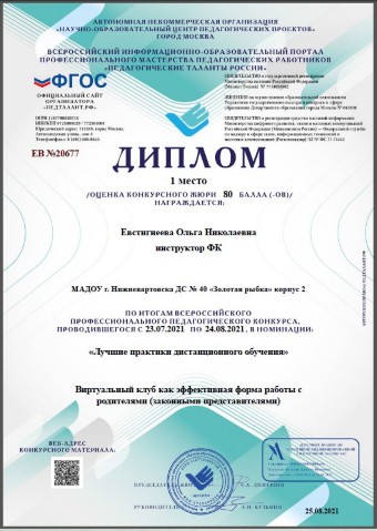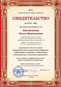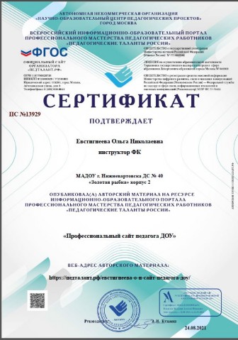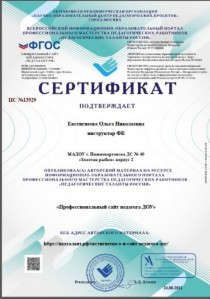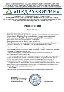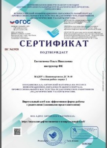 Сертификат на педагогическую разработку в секции "Спортивное развитие и здоровье детей" очного тура Всероссийского фестиваля педагогического творчества Ассоциации творческих педагогов россии