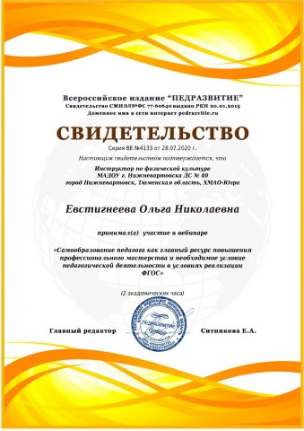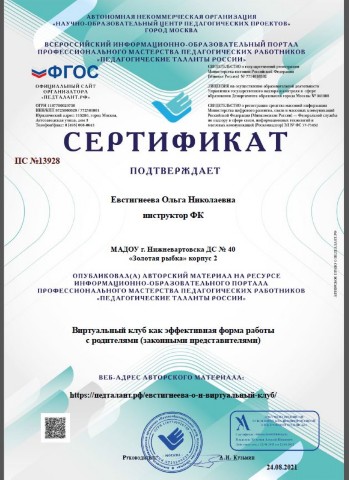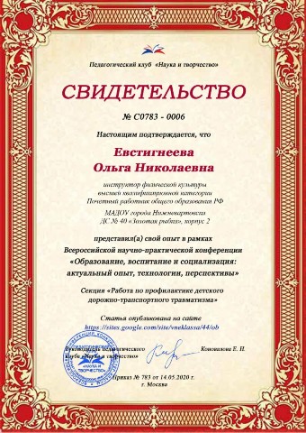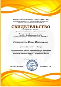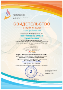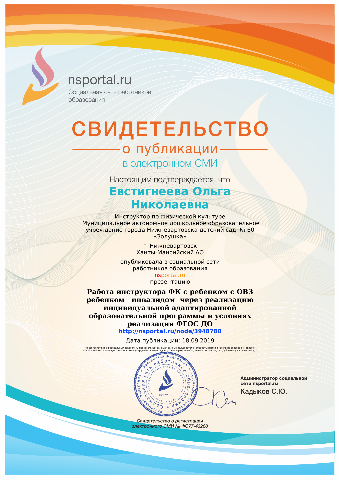 Свидетельство о публикации в социальной сети работников образования материала на тему "Работа инструктора ФК с ребенком ОВЗ, ребенком инвалидом, через реализацию индивидуальной адаптированной образовательной программы в условиях реализации ФГОС ДО"