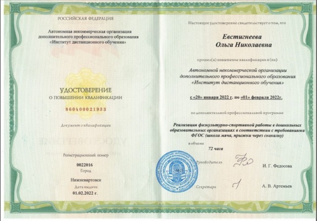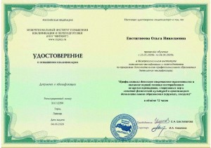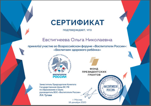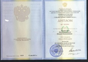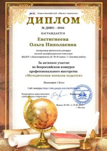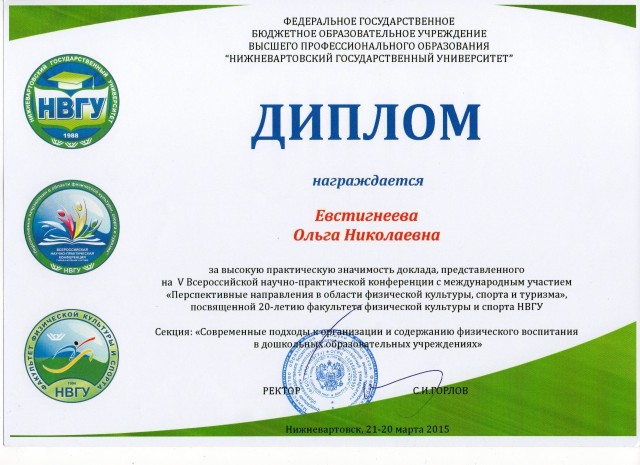 Диплом участника V Всероссийской научно-практической конференции "Перспективные направления в области физической культуры, спорта и туризма" Доклад в секции "современные подходы к организации и содержанию физического воспитания в дошкольных образовательных учреждениях "