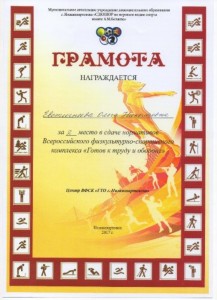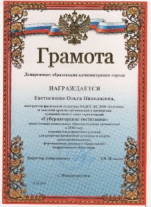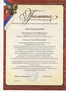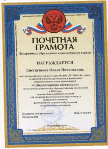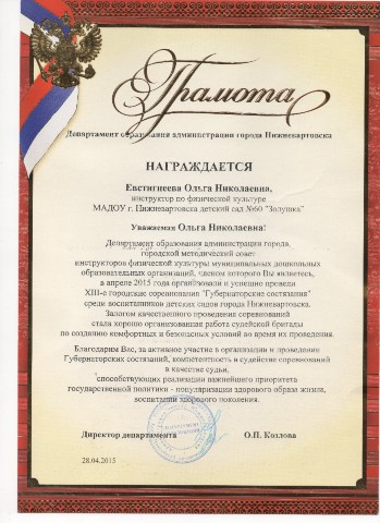 Грамота Департамента образования администрации г. Нижневартовска за активное участие в подготовке и проведении Губернаторских состязаний в качестве судьи (2015г)