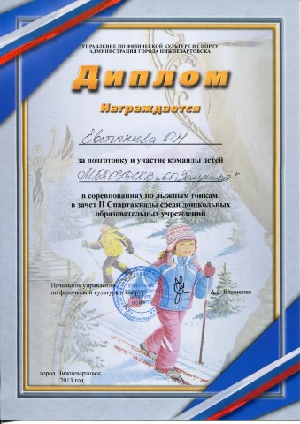 Диплом Управления по физической культуре и спорту Администрации города нижневартовска за подготовку и участие команды детей МАДОУ "Золушка" в соревнованиях по лыжным гонкам в зачет II Спартакиады среди ДОУ