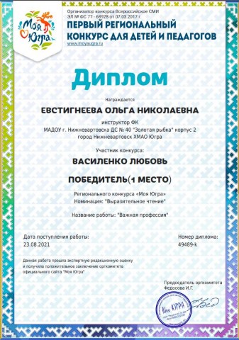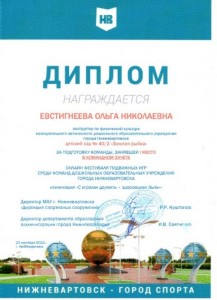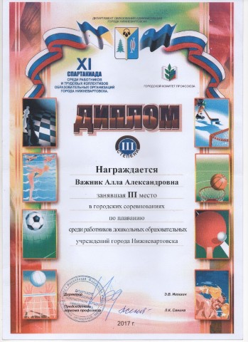 Диплом городского комитете профсоюзов г. Нижневартовска за победу участника МАДОУ г. Нижневартовска ДС № 60 "Золушка"в городских соревнованиях по плаванию среди работников дошкольных образовательных учреждений