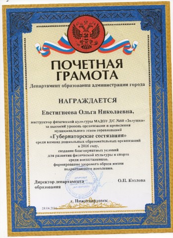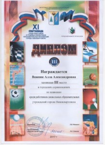 Грамота Департамента образования администрации г. Нижневартовска за активное участие в подготовке и проведении Губернаторских состязаний в качестве судьи