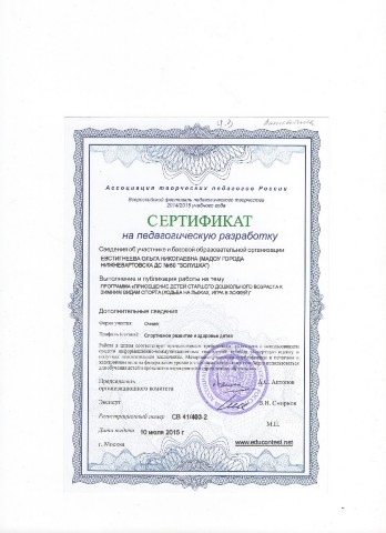 Сертификат всероссийского уровня на Программу физкультурно - спортивной направленности для детей 5 -7 лет «Приобщение детей старшего дошкольного возраста к зимним видам спорта" в секции "Спортивное развитие и здоровье детей" очного тура Всероссийского фестиваля педагогического творчества Ассоциации творческих педагогов россии