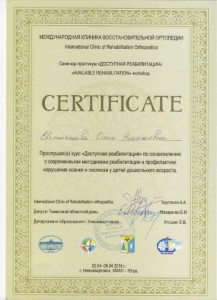 Сертификат слушателя семинара-практикума Международной клиники восстановительной ортопедии "Доступная реабилитация" (современные методики реабилитации и профилактики нарушений осанки и сколиоза у детей дошкольного возраста)